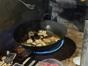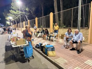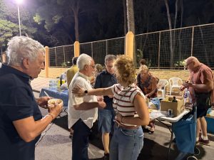 Nos acomodaron en el jardín y, al segundo plato nos cayó una buena lluvia, con lo que pasamos a cenar: sardinas en su propia salsa y/o churrasco de pollo al agua. Una anécdota más para recordar.